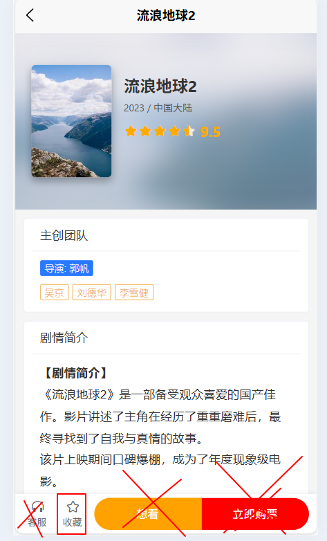 - 展示大幅背景图(可做模糊处理)、清晰海报、电影标题、评分、上映年份、国家/地区。